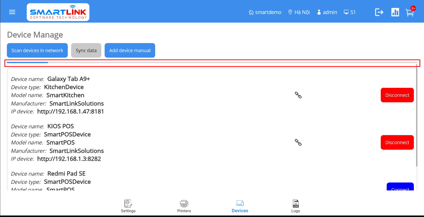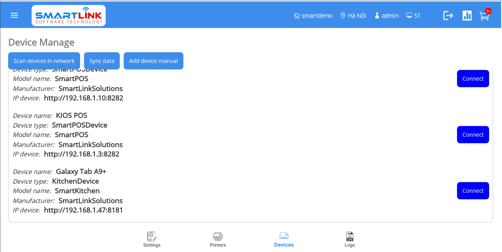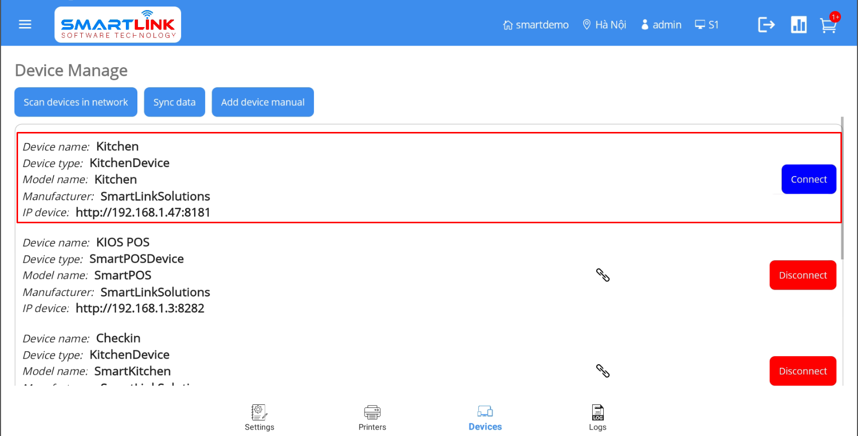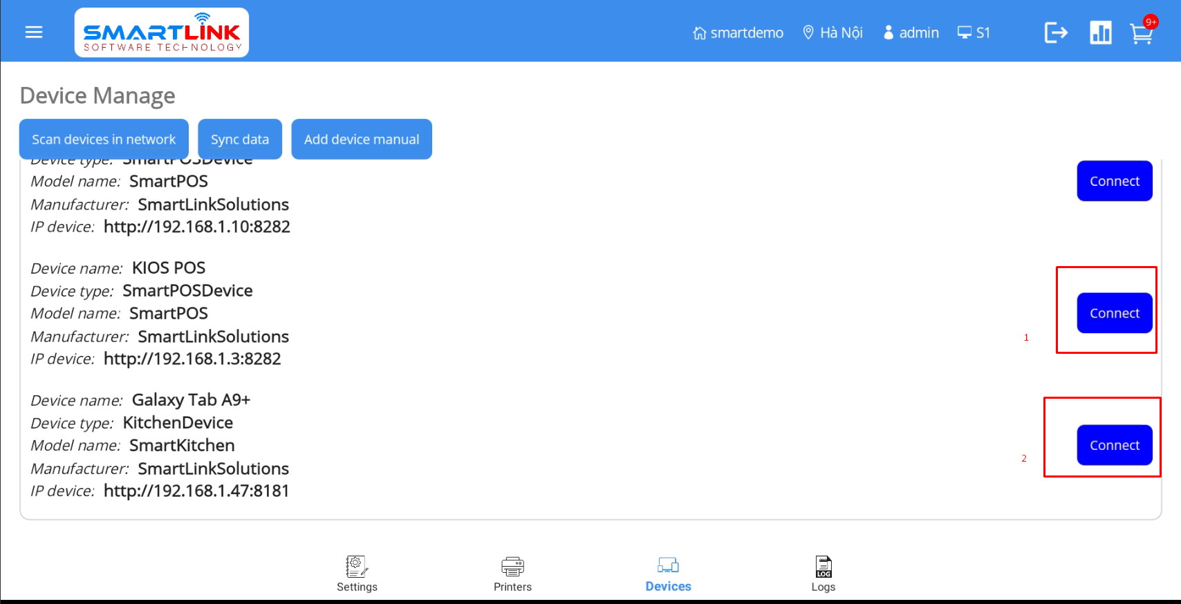 ● Users need to click to connect the POS device[1] and the Kitchen device[2]